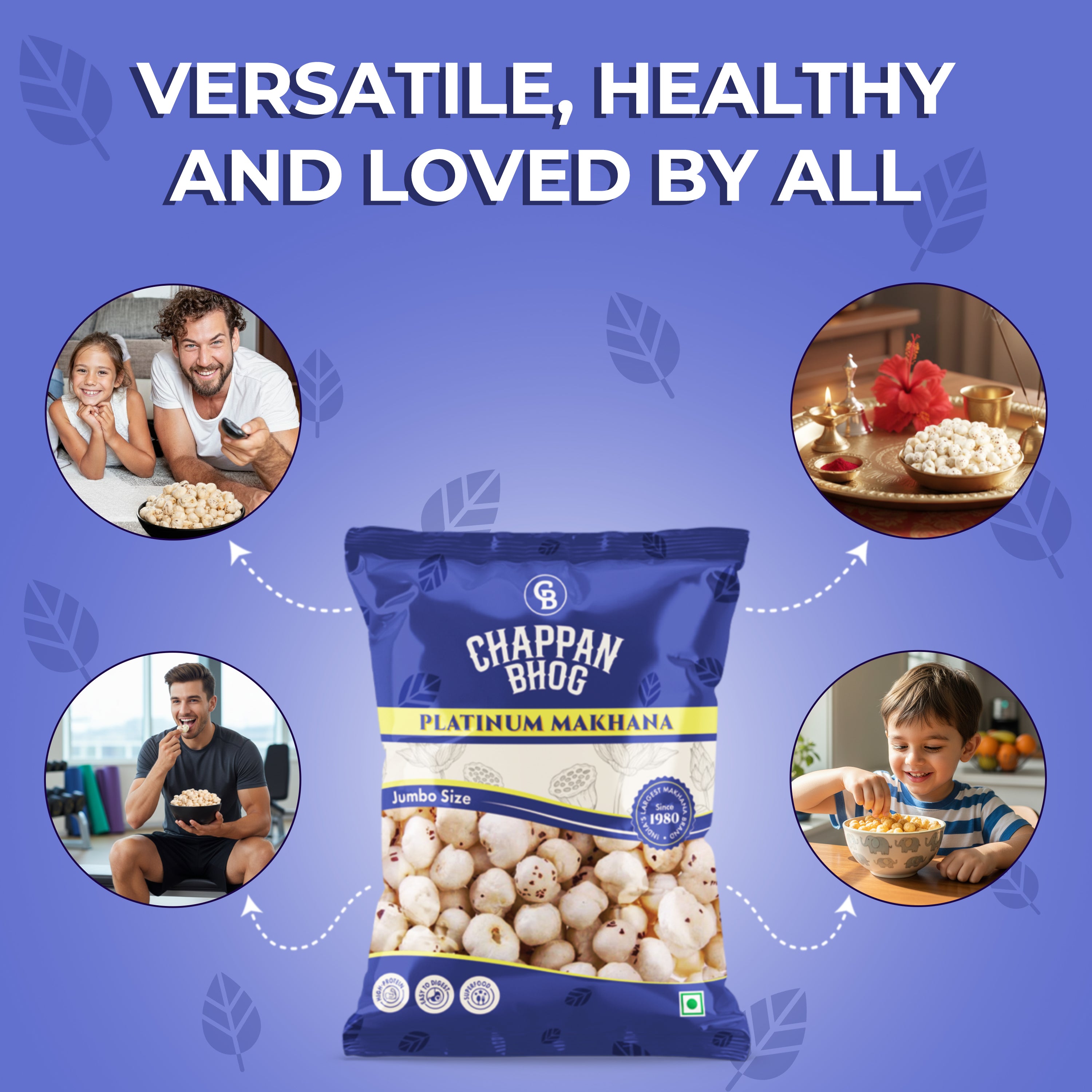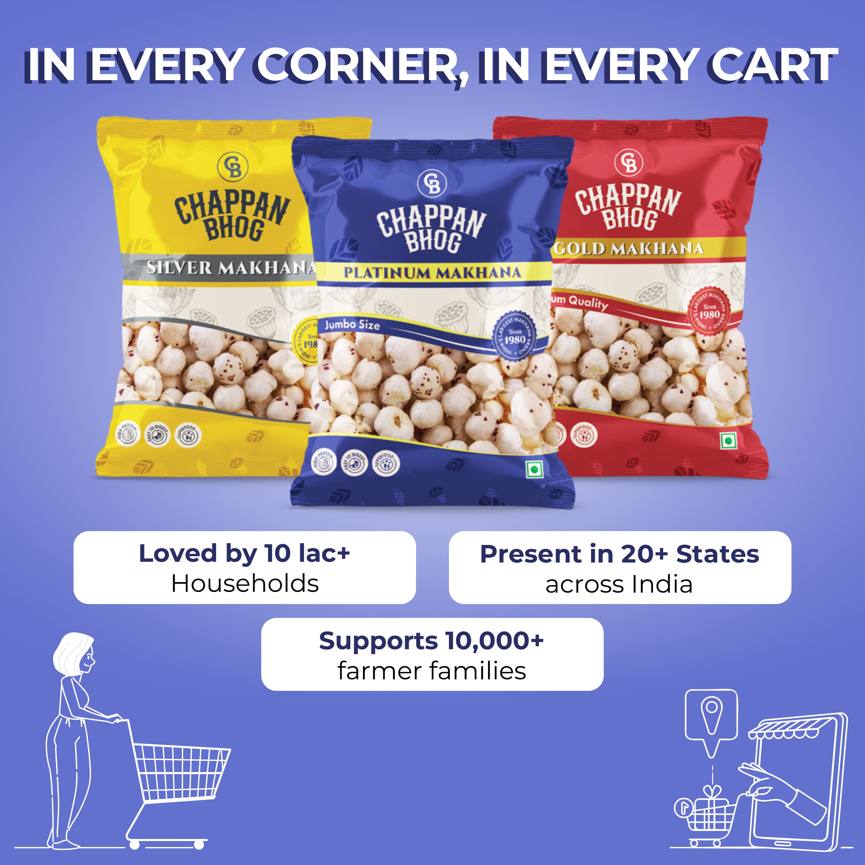 INDIA’S NO. 1 MAKHANA BRAND: Trusted by over 4 crore households, Chappan Bhog offers premium Silver, Gold, and Platinum makhana in multiple pack sizes. Established in 1980, we are one of India’s oldest and largest brands, sourcing from 10,000+ farmer families using traditional methods. With 2 billion+ consumers and 25% market share, Chappan Bhog blends quality, trust, and community impact in every bite.